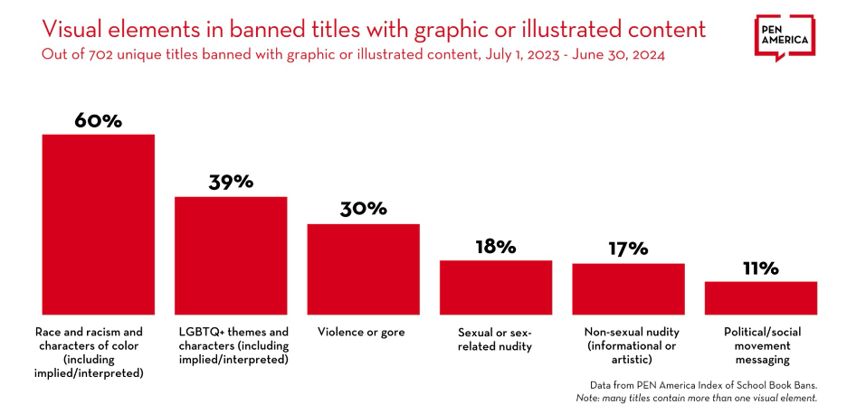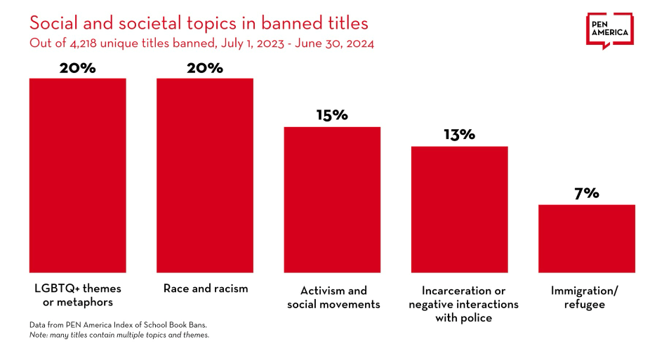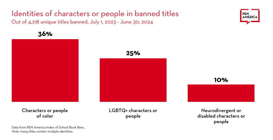 In the 2025 analysis of the 4,218 banned titles, PEN America found that certain identities are overwhelmingly targeted with 36% (1,534 titles) of banned titles featuring characters or people of color and 25% (1,066 titles) featuring LGBTQ+ characters or people. Of the banned titles with LGBTQ+ characters, 28% included trans and/or genderqueer characters. In addition, many banned books feature multiple marginalized identities; 54% of books with LGBTQ+ characters or people also included characters or people of color.