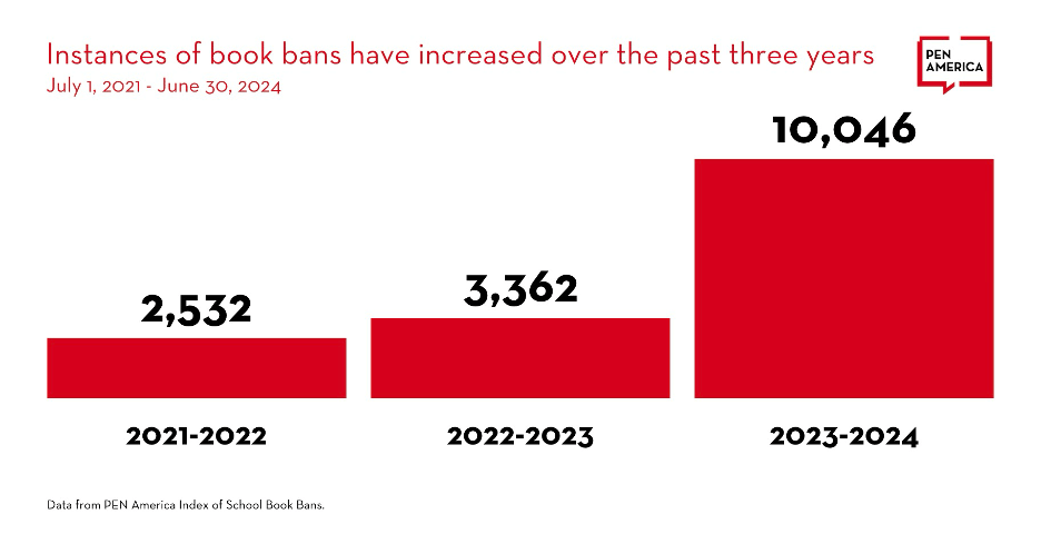 The number of banned books has been increasing at an alarming rate over the last few years. PEN America analyzed book bans in public schools nationwide for the past three years. In that short time, the instances of book bans jumped from 2,532 to over 10,000, with the number of unique titles banned increasing from 1,643 to 4,218.