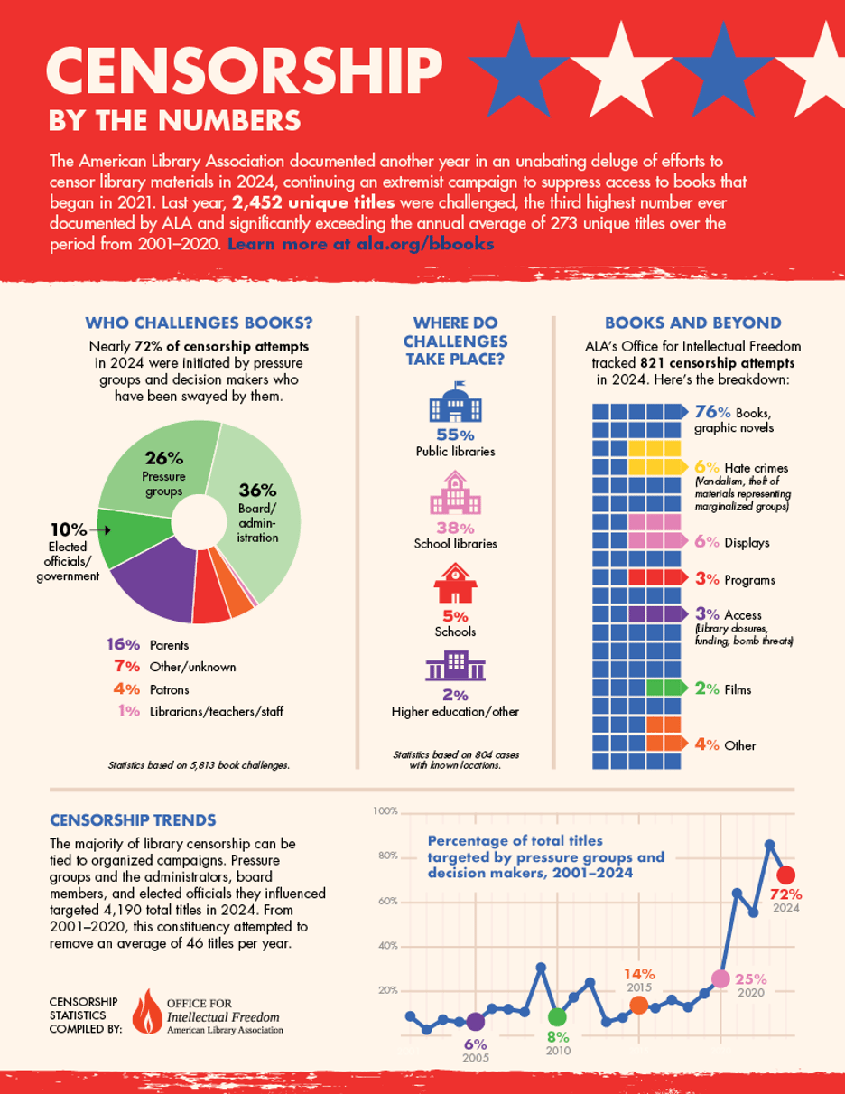 A new national survey of 4,096 secondary English teachers offers urgent insight into how censorship unfolds in K-12 schools, and who really bears the burden. This research, published in Reading Research Quarterly, is a pivotal resource for advocates of intellectual freedom, educators, and community organizers pushing back against book bans. Read the full report here. Among the teachers surveyed, 1,793 reported that books were censored in their schools, underlining the prevalence of censorship across districts. The study revealed troubling patterns: